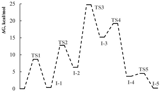 Next, within the resulting Michael adduct I-2, an intramolecular proton transfer from the N35 atom to the N48 atom occurs, yielding an eight-membered cyclic transition state TS3. This process has the highest activation energy and, therefore, should be considered the rate-limiting step. After the protonation of the N48 atom, an intramolecular nucleophilic attack of the N35 atom on the C46 atom occurs to close a pyridine ring. Thus, the resulting anion I-5 then undergoes a secondary protonation of the N48 atom to form intermediate I-6. The energy profile of this process is shown in Figure 3, and the energy profile for oxidative cyclization to form the 1,2-dithiol fragment is given in Figure 4.
