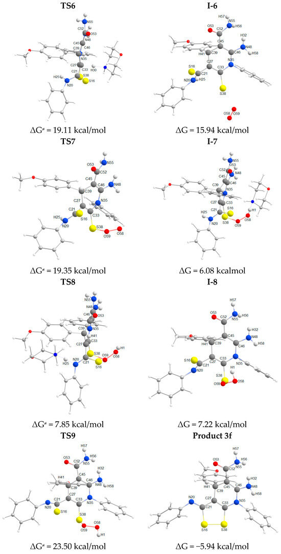 Molecular structures of intermediates I-6–I-8, dithiolopyridine 3f and transition states TS6–TS9 (geometry and energy optimized at the B97-3c level).