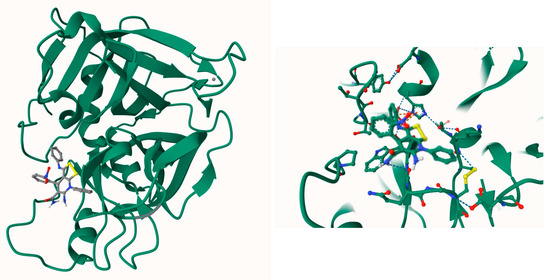 As we can see from Table S25, for both the (R)- and (S)-enantiomers of 3H-[1,2]dithiolo[3,4-b]pyridines 3a-f, a similar pool of protein targets is predicted, but the scoring function values are different. The most common targets for 3H-[1,2]dithiolo[3,4-b]pyridines 3a-f are human trypsin 1 (PDB ID 1trn_A), with ΔGbind values ranging from −19.65 kcal/mol to −21.415 kcal/mol; urokinase-type plasminogen activator (PDB ID 3khv), with ΔGbind = −21.003…−24.09 kcal/mol; coagulation factor VII (PDB ID 4yt6_H), with ΔGbind = −18.771…−21.267 kcal/mol; focal adhesion kinase 1 (FAK1, PDB ID 4gu6_A), with ΔGbind = −23.786…−25.831 kcal/mol; proto-oncogene tyrosine-protein kinase LCK (PDB ID 3ac8_A), with ΔGbind = −21.315…−23.956 kcal/mol; serine/threonine-protein kinase B-raf (PDB ID 4mnf), with ΔGbind = −20.983…−24.744 kcal/mol; and sterile alpha motif and leucine zipper containing kinase ZAK (PDB ID 7yaw), with ΔGbind = −23.539…−25.157 kcal/mol. One of the protein–ligand complexes was visualized using the GalaxySagittarius-AF software package (https://galaxy.seoklab.org/index.html, accessed on 30 December 2023) and is shown in Figure 6.