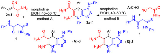 We found that 3-aryl-2-cyanoacrylamides 2a-f react with dithiomalondianilide 1 in hot ethanol in the presence of morpholine to form the previously undescribed 6-amino-4-aryl-7-phenyl-3-(phenylimino)-4,7-dihydro-3H-[1,2]dithiolo[3,4-b]pyridine-5-carboxamides 3a-f, with yields of 37–54% (Scheme 3, Method A). Dithiolopyridines 3 can also be prepared in a one-pot manner via a reaction of aromatic aldehydes, cyanoacetamide and dithiomalondianilide 1 under similar conditions (Scheme 3, Method B); however, in this case, the yields of products 3 are somewhat lower (22–43%, Table 1). The reaction proceeded smoothly in EtOH; other solvents, such as i-PrOH or acetone, produced rather unsatisfactory results. The nature of amines (morpholine, piperidine and triethylamine) does not significantly affect the yields of products. The prepared [1,2]dithiolo[3,4-b]pyridines 3a-f have a chiral center C-4 and are racemic mixtures of (R)- and (S)-enantiomers.