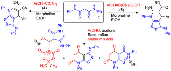 - Dotsenko, V.V.; Aksenov, A.V.; Sinotsko, A.E.; Varzieva, E.A.; Russkikh, A.A.; Levchenko, A.G.; Aksenov, N.A.; Aksenova, I.V. The reactions of N,N′-diphenyldithiomalondiamide with arylmethylidene Meldrum’s acids. Int. J. Mol. Sci. 2022, 23, 15997. [Google Scholar] [CrossRef] [PubMed]