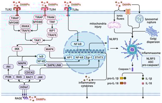 - Gong, T.; Liu, L.; Jiang, W.; Zhou, R. DAMP-sensing receptors in sterile inflammation and inflammatory diseases. Nat. Rev. Immunol. 2020, 20, 95–112. [Google Scholar] [CrossRef] [PubMed]