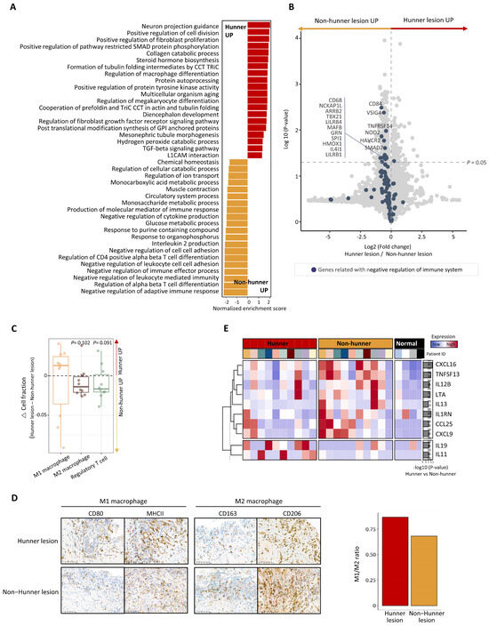 Differences between Hunner and non-Hunner lesions in the mucosal layer of the bladder in patients with Hunner-type interstitial cystitis. (A) Bar plot displaying the top enriched pathways in the comparison between Hunner and non-Hunner lesions. The normalized enrichment score (NES) was determined by gene set enrichment analysis (GSEA). The enriched pathways in Hunner lesions are shown in red and the enriched pathways in non-Hunner lesions are shown in yellow. (B) Volcano plot showing differentially expressed genes (DEG) between Hunner lesions and non-Hunner lesions, with blue dots representing genes related to negative regulation of the immune system. (C) Box plot showing the relative fraction of the cell population estimated by the RNA-seq deconvolution tool. The relative change in the cell fraction was calculated by subtracting the fraction of non-Hunner lesions from that of Hunner lesions. p-values were calculated using a one-way t-test. (D) (Left) Immunohistochemical staining showing elevated cell counts of M1 and M2 macrophages in Hunner lesions compared to non-Hunner lesions. (Right) Bar plot showing an increased ratio of M1 macrophages to M2 macrophages (M1/M2 ratio), defined as the ratio of the average number of cells stained with antibodies representing M1 macrophages to the average number of cells stained with antibodies representing M2 macrophages. (E) Heatmap showing the expression levels of the differentially expressed genes encoding cytokines and growth factors. Statistical significance was estimated using the Wilcoxon rank-sum test, and the p-values are illustrated on the right with bar plots.