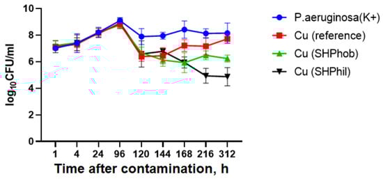As shown in Figure 2, the increase in the number of bacteria at 30 °C lasted up to 96 h in all samples tested. At 216 h, the growth of pseudomonas with the addition of reference copper substrates did not differ from the growth in the control dispersion. The addition of superhydrophobic or superhydrophilic copper substrates reduced bacterial titers to 4 × 107 CFU/mL, compared with 7.2 × 108 CFU/mL for the positive control. However, the greatest antibacterial activity for both superhydrophilic and superhydrophobic copper coatings was observed 144 h after the beginning of the experiments.