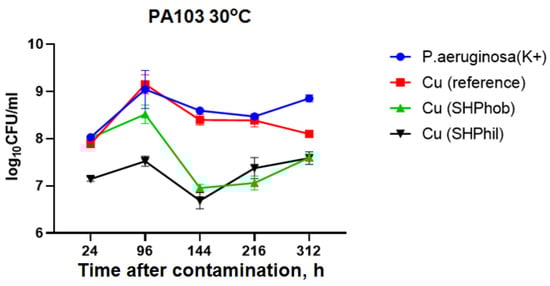 Subsequently, experiments were carried out to study the bactericidal activity of bare, superhydrophobic, and superhydrophilic copper substrates against the same P. aeruginosa PA103 strain at 24, 96, 144, 216, and 312 h, but at 30 °C. The temperature of 30 °C was chosen because the range from 30 to 37 °C is optimal for P. aeruginosa growth.