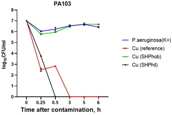 However, it remained unclear whether the antibacterial action of the studied surfaces was temporarily suppressing the viability of P. aeruginosa or completely killing bacteria. Our experiments showed that when P. aeruginosa PA103 was cultivated in PBS with the addition of bare, superhydrophilic, and superhydrophobic copper substrates, growth was completely suppressed at room temperature for 24 h. However, when the PBS assay after contact with copper substrates was cultivated in a nutrient medium without metal for a further 24 h, two different scenarios were observed depending on the initial pseudomonas titer. It turned out that cell viability was completely suppressed at the initial culture titer of 105 CFU/mL, whereas the growth of pseudomonas was restored in the assay with an initial titer of 106 CFU/mL.