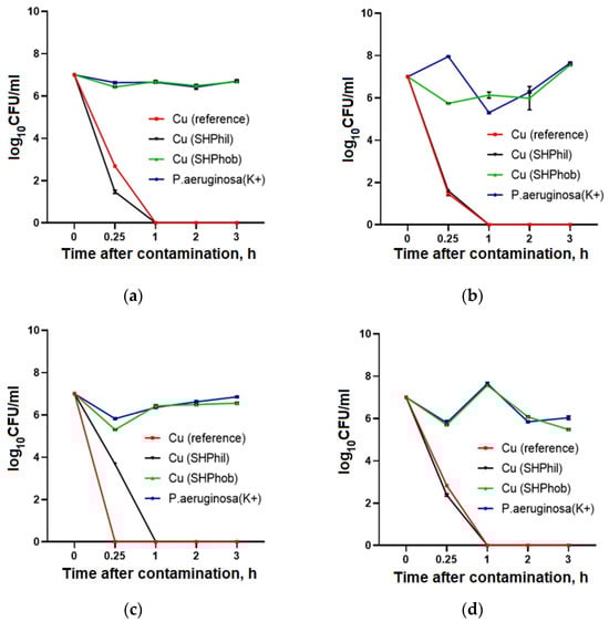 Evaluation of the antibacterial activity of bare, superhydrophilic, and superhydrophobic copper surfaces against P. aeruginosa isolates GIMC5019:PA52Ts1 (a), GIMC5016:PA1840/36/2015 (b), GIMC5021:PA52Ts17 (c), and GIMC5015:PAKB6/2014 (d), within 3 h after application of the bacterial culture to the plates.
