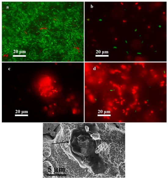 Identification of viable forms of P. aeruginosa PA103: (a) positive control sample, (b) bare copper substrate, (c) superhydrophilic copper substrate, (d) superhydrophobic copper substrate, and (e) scanning electron microscopy image of the cell with disrupted walls (indicated by an arrow) on a superhydrophilic surface. Viable forms of P. aeruginosa are colored green, and non-viable forms are colored red.