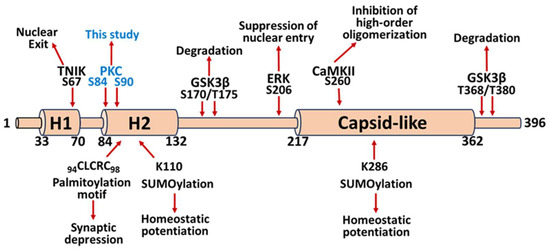 Considering the diverse neuronal functions governed by Arc, it is not surprising that its activities are regulated by numerous post-translational modifications [18], including ubiquitylation, acetylation, SUMOylation, and palmitoylation (Figure 1). Ubiquitylation [19] and acetylation [20] control Arc expression levels by promoting or suppressing proteasomal degradation, respectively. SUMOylation, which regulates Arc function in synaptic scaling [21], strengthens Arc’s association with drebrin A, a protein that promotes actin assembly in dendritic spines [22]. Palmitoylation of Arc, which was first reported by our laboratory, is required for maximal synaptic weakening in response to LTD protocols [23]. Arc has also been reported to undergo phosphorylation by several kinases, including glycogen synthase kinase (GSK)3α and GSK3β, which regulate its proteasomal degradation [24], extracellular signal-regulated kinase (ERK), which regulates its subcellular localization [25], Ca2+/calmodulin-dependent protein kinase IIα (CaMKIIα), which regulates its oligomerization [26], and TRAF2 and NCK-interacting protein kinase (TNIK), which regulates both its subcellular distribution and self-assembly [27]. Although protein kinase C (PKC) has long been implicated in both LTP and LTD [28], the function and regulation of PKC-mediated Arc phosphorylation have not been examined. In this study, we have identified serines 84 and 90 as the major in vitro PKC-phosphorylated residues. These residues reside within the second α-helical segment (helix H2) in the N-terminal domain of Arc. To mimic the effect of phosphorylation, we mutated the two serines to negatively charged glutamic acid. These “phosphomimetic” mutations resulted in a reduced propensity of Arc to undergo palmitoylation, reduced binding to nucleic acids, and reduced stability of high-order oligomers. The latter two characteristics were also displayed by the deletion of H2 and of segments within H2. Taken together, these results suggest that PKC phosphorylation within the H2 helix suppresses palmitoylation-dependent aspects of LTD and intercellular transport of RNA by virus-like Arc particles.