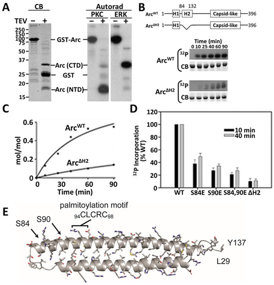 Using the double-TEV GST-Arc construct, we determined that residues phosphorylated by PKC in vitro are concentrated in ArcNTD, whereas those phosphorylated by the MAP kinase ERK2 are located almost exclusively within ArcCTD, as reported previously [25] (Figure 3A). Arc contains four serine residues (S84, S90, S260, and S390) predicted to undergo phosphorylation by PKC [2]. Two of these putative PKC sites, S84 and S90, are located within the second α-helical segment of ArcNTD (residues 84–132, which we designate as “H2” in Figure 1). Phosphorylation of S84 was detected in a high-throughput screen (PhosphoSite) [34] but has not been further investigated. Deletion of H2 diminished PKCα-mediated phosphorylation of Arc by approximately 6-fold (Figure 3B,C). We confirmed by mutational analysis that serines 84 and 90 account for at least 80% of the PKC phosphorylation of segment H2 (Figure 3D). Figure 3E shows the structure of residues 29–137, encompassing helices H1 and H2, as predicted by AlphaFold [35,36]. The PKC phosphorylation sites are near the hinge between the two helices and in close proximity to the palmitoylation motif.
