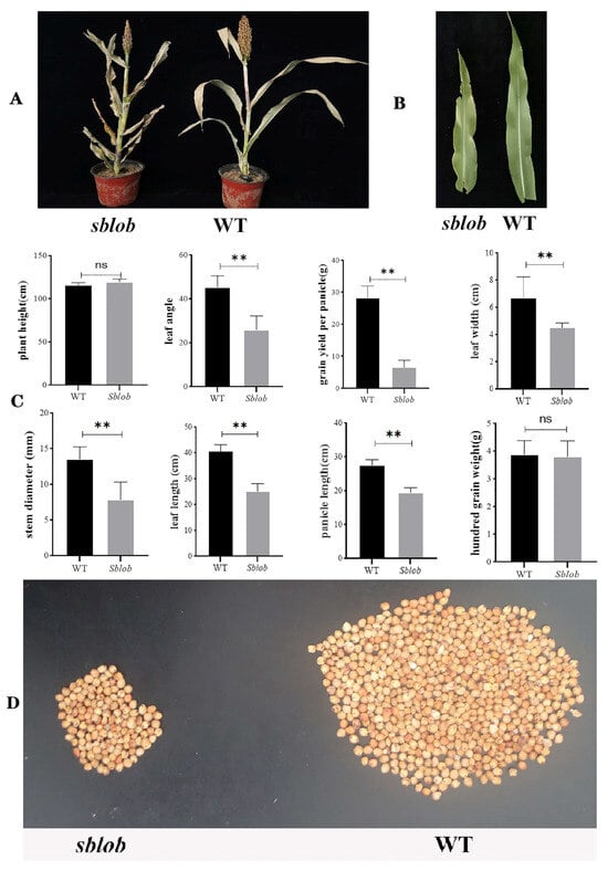 Assessment of phenotypic characteristics and agronomic traits of WT and sblob plants. (A) The phenotypes of WT and sblob at the harvest stage. (B) Flag leaf phenotypes of WT and sblob at the heading stage. (C) The grain yield per panicle and grain phenotype of WT and sblob. (D) Presentation of comparative analysis of differences in plant height, panicle length, flag leaf length, flag leaf width, grain weight per panicle, and 100-grain weight between WT and sblob. All values are represented as means ± SD (n = 3). ** Indicates a significant difference between groups of 0.01, while ns indicates no significant difference.