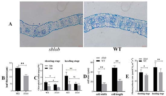 Microscopic examination of leaf anatomical characteristics and photosynthetic efficiency analysis of both WT and sblob. (A) Paraffin section observation of a leaf from WT and one from sblob at the shooting stage. The scale bar represents 50 μm. (B) Leaf thickness of WT and sblob at the shooting stage. (C) Chlorophyll content of sblob and WT plants at the shooting and heading stages. (D) Cell size analysis of leaf from WT and sblob at the shooting stage. (E) Photosynthesis efficiency analyses of WT and sblob at the shooting and heading stages. * And ** indicate significant differences between groups of 0.05 and 0.01, respectively, while ns indicates no significant difference.