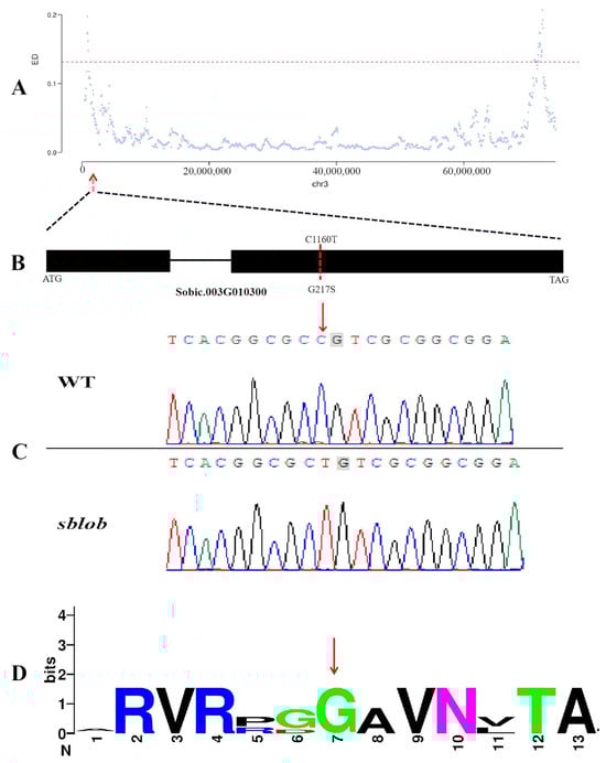 Mapping of sblob1 gene. (A) Presentation of Euclidean distance (ED) correlation values across sorghum chromosome 3. Each blue dot represents the ED value of an individual single-nucleotide polymorphism (SNP) locus, while the red dashed line represents the significant correlation threshold. The red arrow indicates the identified candidate SNP locus. (B) Illustration of sblob1 structure and its mutation site. The ATG and TGA were at the left and right ends, respectively, representing the start and stop codons. Exons are depicted by black boxes; introns are represented by lines. The red line and text in the second exon specify the position and nature of the base mutation in the sblob mutant. (C) The DNA sequence at the candidate mutant site in sblob and WT plants. The red arrow highlights the mutant site. (D) Analysis of conservation in the amino acid substitution region and its frequency among homologous plant genes. The red arrow indicates the position of the amino acid substitution in the sblob mutant.