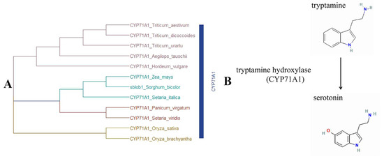 Protein BLAST analysis and Pfam analysis showed that Sobic.003G010300 encodes an SbCYP71A1 protein, which belongs to the Cytochrome P450 superfamily (CYP) (Figure 4A). Homology alignment and gene annotation revealed that the CYP71A1 gene codes for the tryptamine 5-hydroxylase enzyme (Figure 4B), a crucial component in the plant serotonin/melatonin biosynthesis pathway [30,31]. This confirmed that Sobic.003G010300 is a potential candidate gene for sblob1.