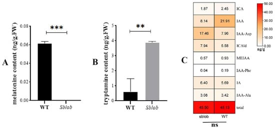 Melatonin, tryptamine and hormone content determination. (A) Melatonin content of sblob and WT. (B) Tryptamine content of sblob and WT. (C) Auxin content of sblob and WT. ** and *** indicate a significant difference between groups of 0.01 and 0.001, respectively, while ns indicates no significant difference.