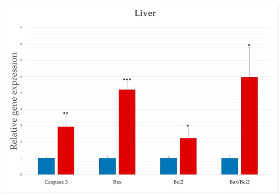 Total RNA was isolated from frozen liver samples (30 mg) using the RNeasy Mini Kit (A&A Biotechnology, Gdańsk, Poland) according to the manufacturer’s recommendations. Elution was performed in 100 μL. The quantity and purity of the isolates were analyzed using the NanoDrop™ 2000 spectrophotometer (Thermo Fisher Scientific, Waltham, MA, USA). Reverse transcription of RNA isolates (in the amount of 200 ng determined on the basis of the concentrations) was performed using Transcriptor First Strand cDNA Synthesis Kit (Roche Diagnostics GmbH, Mannheim, Germany) as recommended by the manufacturer. Quantitative real-time PCR was performed using the LightCycler® 480 Instrument II (Roche Diagnostics GmbH, Mannheim, Germany) and the PowerUp™ SYBR™ Green Master Mix (Thermo Fisher Scientific, Waltham, MA, USA) according to the manufacturer’s instructions. In the study, specific primers were used [28,31]: Caspase-3—F(5′-GCTGGACAGTGGCATCGAGA-3′) and R (5′-TCCGAATTTCGCCAGGAATAGTAA-3′), Bax—F (5′-GTGTCTCAAGCGCATTGGCG-3′) and R(5′-CAAACATGTCGGCCTGCCACT-3′), Bcl-2—F(5′-GATTGTGGCCTTCTTTGAGTTC-3′) and R (5′-GGCAGCGATCATCCTCTGTA-3′), β-actin—F(5′-TGGCATCCTGACGCTCAA-3′) and R (5′- TCGTCCCAGTTGGTCACGAT-3′). The threshold cycle (Ct) values were normalized by β-actin gene expression, and the relative gene expression was calculated using the Pfaffl method [32].