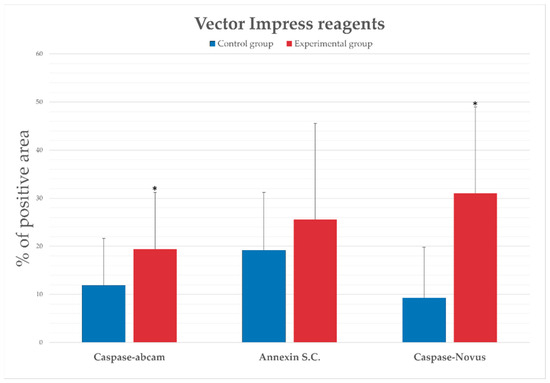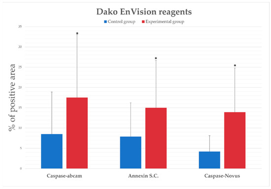Percentage of the immunopositive area obtained from computer analysis using 3DHISTECH (version 2.5; Budapest, Hungary) with the support of an image analysis platform for immunohistochemically stained images SlideViewer. The differences between experimental and control groups in the expression of caspase-3 (antibodies from Abcam and NovusBiologicals) and between experimental and control groups in the expression of annexin V are marked. Data are presented as mean and SD. The experiments were repeated independently twice, and the results obtained were presented in the form of one graph. Slides were stained with an EnVision set of reagents. Statistical significance is marked as * p ≤ 0.05.