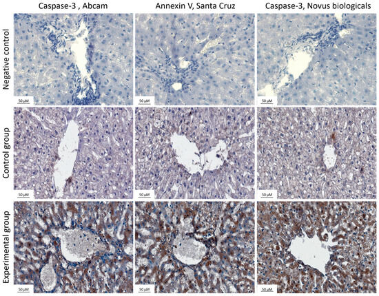 Livers stained with markers for apoptosis: procaspase-3 (Abcam, Cambridge, UK), left column, annexin V (Santa Cruz, Biotechnology, Dallas, TX, USA), middle column, active form of caspase-3 (Novus Biologicals, Centennial, CO, USA), right column. The top row shows the negative control. The middle row shows sections from the control group and the bottom row shows sections from the experimental group. Magnification applied ×40. Pictures taken by Leica (DM5000B, Wetzlar, Germany). Slides were stained with a VectorImpress set of reagents. The experiments were repeated independently twice (n = 10).