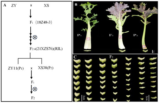 The materials used in this experiment were all owned by the Cruciferous Vegetable Crop Genetic Improvement Technology Innovation Laboratory of Northwest A&F University. The F1 generation was obtained through the crossbreeding of non-heading Chinese cabbage ZY and XS, with continuous self-pollination to produce the inbred line F2:4 (RIL). Among them, ZY11 with extremely thin petiole was selected from F2,4 family 21XZS76 as parent P1, XS38 with extremely thick petiole was selected as parent P2, and F1 was obtained by hybridization. F1 was self-pollinated to obtain the F2 segregating population (Figure 1A). The above non-heading Chinese cabbage RIL population, parents ZY11 and XS38, were planted in the greenhouse of Caoxinzhuang Experimental Farm at Northwest A&F University, and routine management was carried out. Generation groups P1, P2, F1, and F2 were planted in the Caoxinzhuang experimental farm. The inbred lines, parents, and F1 generations of the RIL population were planted with 20 plants each, three blocks each, and 360 plants were planted in the F2 generation. The plant spacing was 20 cm, and the row spacing was 25 cm. After 30–40 days of planting,