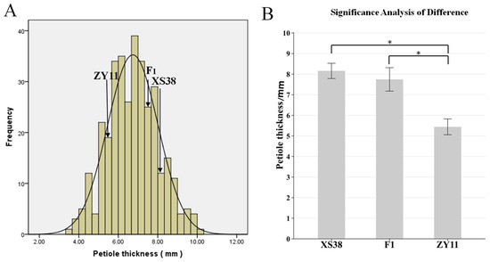 F2 petiole thickness frequency distribution histogram and parental petiole thickness difference significance analysis. (A) F2 mapping population and the distribution of petiole thickness at different times. (B) Significant difference analysis between XS38 and ZY11 and F1, * p < 0.05.