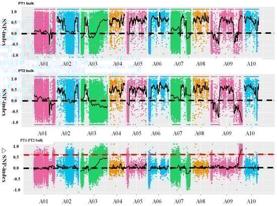 Distribution of SNP (single nucleotide polymorphism)-index correlation values along chromosomes. The abscissa represents chromosome names, colored dots represent calculated SNP-index (or ΔSNP-index) values, and Black dotted line is coordinate line, black solid line represent fitted SNP-index (or ΔSNP-index) values. The upper panel depicts the distribution of SNP-index values for the PT1 (thick petiole 1-dominant) bulk; the middle panel illustrates the distribution of SNP-index values for the PT2 (thin petiole 2-recessive) bulk; the lower panel shows the distribution of ΔSNP-index values, with the red line indicating the threshold line at the 99th percentile.
