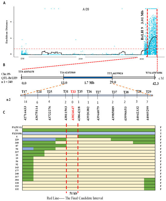 Fine mapping of main effect QTL-BrLH9. (A) SNP candidate regions associated with the ED (Euclidean distance) algorithm on chromosome A09. Blue dots represent calculated ΔSNP-index values, with the main effect of QTL-BrLH9 covering a region of 3.01 Mb indicated by the red horizontal line, and the vertical red line representing the associated region. (B) Primer sets for fine mapping within the interval, where the first four represent initial dual-flanking primers. The primer names and positions are shown at the top, and genetic distances and interval sizes are provided at the bottom, spanning 1.7 Mb. The chromosome location is indicated on the left. The F2 mapping population used comprises n1 = 340, with n2 denoting the number of recombinant individuals exhibiting the thin stem phenotype. Encrypted primer names are at the top, accompanied by the number of recombinants and physical positions. Notably, no recombinants were identified by Marker T33, The blue area is the initial positioning interval. (C) Different colored lines represent different genotypes: Yellow for P1 (ZY11), green for F1, and light blue for P2 (XS38). The left end of each line indicates the identifier of parental, F1, and F2 recombinant individuals, while the right end indicates the stem phenotype: F for thin and T for thick. The red vertical line marks the final fine mapping interval of 51 kb.