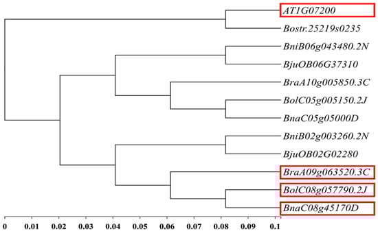Based on the 51 kb interval of the main effect QTL-BrLH9 and functional annotations from the Brassica database (BRAD), ten genes were annotated within the candidate region. These genes were aligned to A. thaliana information resources in the Arabidopsis Information Resource (TAIR) to search for homologous genes. According to BSA-seq data, three genes in this interval harbored non-synonymous mutations: BraA09g063490.3C, BraA09g063520.3C, and BraA09g063530.3C. Among them, BraA09g063520.3C also contained a frameshift mutation (Table 3). The A. thaliana homolog of BraA09g063520.3C was AT1G07200, also known as SMAX1-LIKE 6 (SMXL6). This gene was the closest to BraA09g063520.3C in rapeseed (Brassica napus L.), where it was annotated as SMAX1-LIKE 6 (Figure 5). SMXL6 is an inhibitor in the Strigolactone signaling pathway and exerts dual functions in protein–DNA binding. It represents the only gene within this interval that is clearly associated with the petiole phenotype.