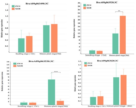 Four genes had mutations in exons. Specifically, BraA09g063520.3C displayed both frameshift and non-synonymous mutations. The relative expression levels of all genes in the interval were quantified in real-time fluorescent assays. The results showed differential expression of BraA09g063520.3C in the petiole tissue of parent materials. During the seedling stage (15 d), the difference in expression between thick-petioled ZY11 and thin-petioled XS38 was not significant and was low. This might be attributed to the early initiation of expression and the limited phenotypic differences at that stage. However, during the mature stage (30 d), expression of BraA09g063520.3C in the thick-petioled XS38 was significantly higher than in the thin-petioled ZY11, reflecting the differences in petiole thickness between the two types (Figure 6). For BraA09g063530.3C, there was no significant expression difference in the seedling stage’s petioles (15 d), while in mature plants, it was significantly more expressed in ZY11 than in XS38. Expression of the other mutated genes within the interval showed low and non-significant differences in expression between the parent materials. The relative expression levels of other genes in the interval were low and exhibited insignificant differences.