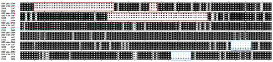 Furthermore, the full-length genome of the gene BraA09g063520.3C in the parents ZY11 and XS38 was compared with the software SNAPGENE (www.snapgene.com). The total length of the reference genome was 3565 bp, the ZY11 clone sequence was 3483 bp, and the XS38 was 3565 bp. The results showed that the sequence of XS38 had individual base mutations, and the frameshift mutation length was equal to the reference genome sequence. In ZY11, there were multiple frameshift mutations and non-synonymous mutations. There were two frameshift mutations in the amplification length range of Marker T33, resulting in the deletion of large fragments (Figure 7), which also explained that Marker T33 was completely consistent in the vertical gel electrophoresis of thin petioles and could well distinguish thin and thick petioles through this marker. The cloning results showed that there were 5 frameshift mutations and 2 frameshift mutations on primer T33.