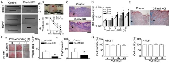 Effect of high concentrations of KCl on cutaneous wound healing. (A) In vitro wound healing assays in HaCaT cells and HNDFs. Enhanced wound closure in cell monolayers of HaCaT and HNDFs treated with 25 mM KCl at 12 and 33 h, respectively (n = 6). (B) In vivo wound healing assays in rats. Upper panel: Two full-thickness wounds (2 cm diameter) were created on the backs of rats. Wounds were treated with either 5 mM KCl (control) or 25 mM KCl. A representative photograph on day 14 post-wounding is shown. Lower panel: Quantitative analysis of wound areas; plotted as a percentage of the initial area measured at day 0 (n = 6). The graph demonstrates a significant reduction in wound size in the 25 mM KCl-treated group compared to controls. (C) Histologic examination (H&E Staining) of cutaneous wounds in rats. The histological sections show the epithelialization of the epidermis (indicated by arrows) in rat skin wounds (n = 3). (D,E) Effect of high concentrations of KCl on collagen levels in human neonatal dermal fibroblasts (HNDFs) and collagenesis in rat skin (n = 3). Analysis of collagen levels in HNDFs treated with high concentrations of KCl (D). Masson’s trichrome staining of rat skin, indicating collagen (marked by arrows) (E). (F) In vivo wound healing assays in pigs (n = 3). (F(a)) Representative photographs of wounds at days 0, 5, and 10 post-wounding. (F(b,c)) Comparative analysis of wound area and erythema ratio between control and 25 mM KCl-treated wounds. (G) Cell viability of HaCaT cells and HNDFs in response to high concentrations of KCl (n = 3): cells were treated with various concentrations of KCl for 24 h. The data are presented as mean ± SD from three to six independent experiments. Asterisks indicate a significant difference from control values (p < 0.05). All scale bars represent 200 μm.