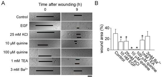 The application of 25 mM KCl for inhibiting K+ channels was found to promote wound healing both in vitro and in vivo (Figure 1). To verify the connection between K+ channel inhibition and wound healing in normal human epidermal keratinocytes (NHEKs), various K+ channel blockers were evaluated. As shown in Figure 2, wounds in NHEKs treated with either 10 or 100 µM quinine exhibited significantly better healing compared to untreated control NHEKs (p < 0.05). In a manner akin to the use of epidermal growth factor (EGF) as a positive control, wound healing was enhanced by 14% with the application of 25 mM KCl compared to controls. The use of 1 mM tetraethylammonium (TEA) also resulted in notable wound closure when compared to the control group (p < 0.05). However, 3 mM Ba2+, commonly used as a blocker for voltage-dependent K+ channels, did not show any improvement in wound healing (Figure 2A,B).
