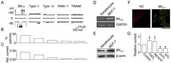 Expression of BKca channels in human keratinocytes. (A) Single-channel currents in cell-attached patches of NHEKs. Recordings from cell-attached patches on NHEKs revealed five types of channels, each with distinct opening kinetics. Both pipette and bath solutions contained 150 mM KCl. The K+ selectivity of each channel type was confirmed by measuring reversal potential shifts after altering the bath (KCl) and by the absence of outward current in Na+-containing solutions. (B) Distribution of K+ channel types. The bar graph shows the percentage of patches exhibiting each type of K+ channel identified in the NHEKs. (C) Estimated average relative outward current, compiled from 125 patches. (D) RT-PCR analysis for BKCa channel in NHEKs. MCF-7 cells were used as a positive control. (E) Western blotting for BKCa channels in NHEKs. (F) Localization of BKCa in NHEKs. Scale bar, 100 μm. (G) Pharmacological characterization of BKCa channels in NHEKs. The data are presented as mean ± SD from five independent experiments. * p < 0.05 compared to control.