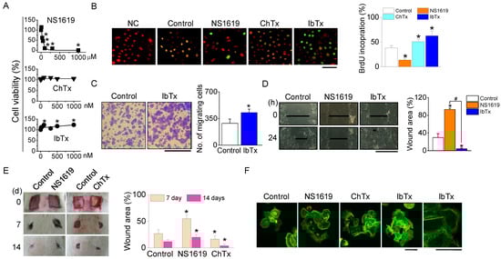 To elucidate the role of BKCa channels in the migration and proliferation of NHEKs during the wound healing process, we first assessed the cytotoxicity of BKCa channel modulators (NS1619, ChTx, and IbTx) on NHEKs. While IbTx and ChTx, at concentrations ranging from 0 to 1000 nM, did not induce significant cell death, NS1619 was found to be cytotoxic, causing 50% cell death at a concentration of 55 µM (Figure 4A). The wound healing process involves the repopulation of the wounded area by adjacent cells through proliferation and migration. To differentiate these processes, we separately evaluated cell migration and proliferation. Furthermore, 5-bromo-2′-deoxyuridine (BrdU) incorporation assays were used to measure cell proliferation during wound closure in NHEK cultures. A higher number of BrdU-positive cells were observed in the cultures treated with ChTx and IbTx (Figure 4B). In transwell migration assays, the migration of IbTx-treated cells towards a 10% FBS gradient was significantly higher compared to control cells (p < 0.05, Figure 4C). IbTx exhibited effects similar to ChTx in wounded NHEKs.