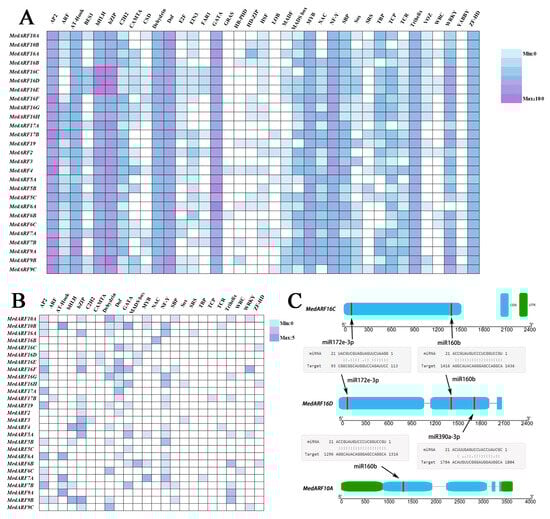 2.5. The cis-Regulatory Elements and Targets of Specific miRNAs for MedARF Genes