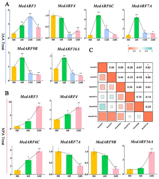 - Liu, R.; Guo, Z.; Lu, S. Genome-Wide Identification and Expression Analysis of the Aux/IAA and Auxin Response Factor Gene Family in Medicago truncatula. Int. J. Mol. Sci. 2021, 22, 10494. [Google Scholar] [CrossRef]