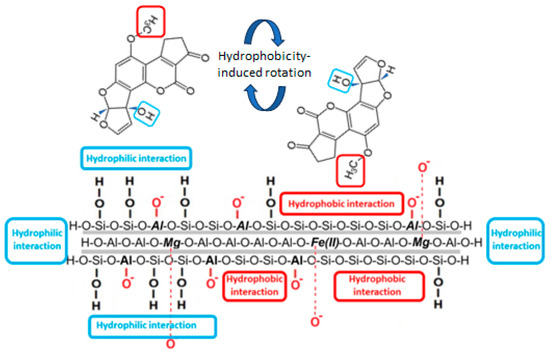 - Deng, Y.; Liu, L.; Velázquez, A.L.B.; Dixon, J.B. The Determinative Role of the Exchange Cation and Layer-Charge Density of Smectite on Aflatoxin Adsorption. Clays Clay Miner. 2012, 60, 374–386. [Google Scholar] [CrossRef]