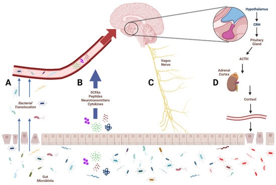 Avenues of communication between the gut and the brain. The four primary avenues of microbiota–gut–brain communication. Damaged epithelium leads to increased translocation of gut bacteria into circulation (A). Microbial metabolites like short-chain fatty acids (SCFAs), neurotransmitters, and cytokines enter circulation to affect central structures (B). The vagus nerve provides a bidirectional communication pathway for the gut and brain (C). Activation of the hypothalamus–pituitary–adrenal (HPA) axis leads to the production of cortisol, which increases intestinal permeability and alters microbial composition (D).