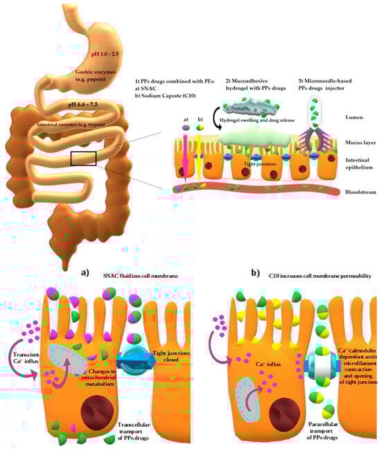 | Proteolytic Enzyme Inhibitors | Substances decreasing enzymatic activity of proteases in GI tract [118] | Prevention of drug degradation [118] | Insulin |