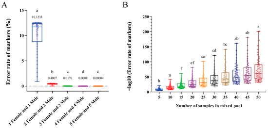 The error rates for the groups of male and female (A) and mixed pools (B) with different individual numbers. The lines in the boxes represent the median, the number above the box indicates the mean, and the whiskers indicate the minimum and maximum. The differently colored circles show each individual test with one million iterations, and different letters indicate significant differences (p < 0.05) among the groups.