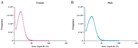 The K-mer spectrum for the genome sequences of female (A) and male (B) P. sinensis.
