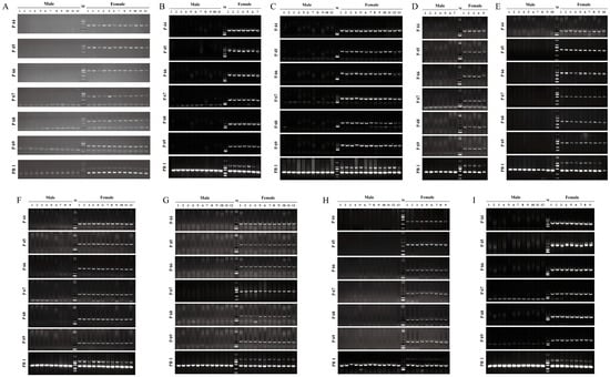 Initial (A) and population validation (B–I) of seven pairs of female-specific primers in adult P. sinensis using the PCR/gel electrophoresis assay. Plates (B–I) represent the populations from Weishanhu, Nanning, Changde, Lianyungang, Tangshan, Jingzhou, Huizhou, and Huzhou, respectively. M, DL 2000 DNA marker.