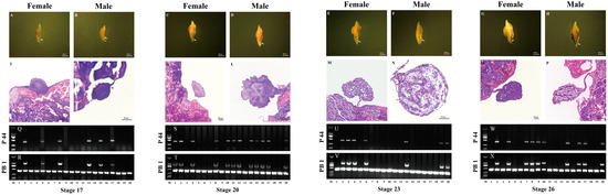 In addition, two pairs of female-specific primers (P44 and PB1) were randomly chosen to confirm the genetic sex of P. sinensis embryos. First, the embryonic gonad-mesonephric complexes of males and females, tested by the female-specific primers P44 and PB1 (Figure 5Q–X), were randomly isolated from stage 17 (Figure 5A,B), stage 20 (Figure 5C,D), stage 23 (Figure 5E,F), and stage 26 (Figure 5G,H), respectively. Afterwards, the sex of the P. sinensis embryos of stage 17 (Figure 5I,J), stage 20 (Figure 5K,L), stage 23 (Figure 5M,N), and stage 26 (Figure 5O,P) was identified via histological observation. The results showed that the gonads of individuals in stage 20, stage 23, and stage 26 were morphologically differentiated and exhibited significant diversity between males and females (Figure 5K–P). Briefly, the gonads of males had a dense medulla with seminiferous cords (Figure 5L,N,P). Differently, the gonads of females had a highly developed outer cortex and a vacuolated medulla (Figure 5K,M,O). However, the gonads of individuals in stage 17 did not have obvious morphological differences (Figure 5I,J), meaning that the gonads had not yet begun to differentiate or had just started. Collectively, the female-specific primers of P44 and PB1 had a 100% accuracy when used to estimate the genetic sex of P. sinensis embryos in stage 17 (Figure 5Q,R), stage 20 (Figure 5S,T), stage 23 (Figure 5U,V), and stage 26 (Figure 5W,X). This is the first complete experimental evidence of using sex-specific markers to distinguish the genetic sex of P. sinensis embryos at different developmental stages.