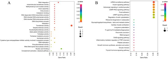 A total of 42 protein-coding genes have been annotated in the NR database (Table S5), including Ran, Eif4et, Crkl, etc. The sex-determining candidate genes are significantly enriched in the catalytic activity of the molecular function, the cellular process of the biological process, and the cellular anatomical entity of the cellular component (Table S6). Among them, 42 of the GO terms were significantly enriched, and the top three significantly enriched GO terms were DNA integration, intramolecular transferase activity, and methylmalonyl CoA mutase activity (Figure 6A and Table S6). Meanwhile, eight KEGG pathways were significantly enriched, including the mRNA surveillance pathway, the insulin signaling pathway, adrenergic signaling in cardiomyocytes, the cGMP-PKG signaling pathway, focal adhesion, the cAMP signaling pathway, the regulation of the actin cytoskeleton, and ribosome biogenesis in eukaryotes (Figure 6B and Table S7).