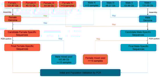 The workflow for sex-specific sequence screening in the ZW or XY sex-determination system.