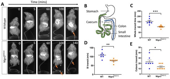 Gastrointestinal function was assessed in wild-type and Nlgn3R451C mice using in vivo X-ray imaging. Transit times were compared between Nlgn3R451C (n = 8) and wild-type (WT) mice (n = 7) by examining the time taken for BaSO4 to travel from the stomach to the anus (whole transit time; WTT), the stomach to the caecum (small intestinal transit time; SITT), and the proximal colon to the anus (colonic transit time; CTT) (Figure 1A,B).
