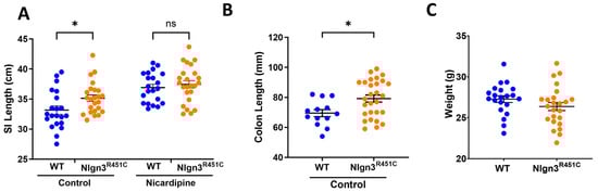 Longer small intestinal and colon length in Nlgn3R451C mice. (A) Wild-type (WT; n = 21) and Nlgn3R451C (n = 24) small intestinal (SI) gut length in the active state (control) and after incubation in 100 µM of the muscle relaxant nicardipine (* p > 0.05 two-way ANOVA test (variables tested: genotype and nicardipine treatment), Sidak correction). Normality assumptions passed (Shapiro–Wilk normality of residuals test: w = 0.98, p = 0.3). (B) Increased colon length in Nlgn3R451C mice (n = 28) compared to wild-type mice (n = 13) (Student’s t-test. * p > 0.05). Normality assumptions passed (Shapiro–Wilk normality test WT: w = 0.95, p = 0.7; Nlgn3R451C: w = 0.9, p = 0.1). (C) No differences were observed between the body weights in a sample of WT (n = 21) and Nlgn3R451C mice (n = 24) (Student’s t-test. * p = 0.17). Normality assumptions passed (Shapiro–Wilk normality test WT: w = 0.97, p = 0.6; Nlgn3R451C: w = 0.98, p = 0.9). ns: not statistically significant.