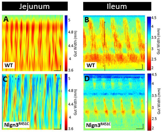 Comparison of small intestinal motility patterns in WT and Nlgn3R451C mice. Spatiotemporal maps (15 min duration) from (A,C) jejunum and (B,D) ileum of WT and Nlgn3R451C mice. Calibration bar: 10 mm, 200 s.