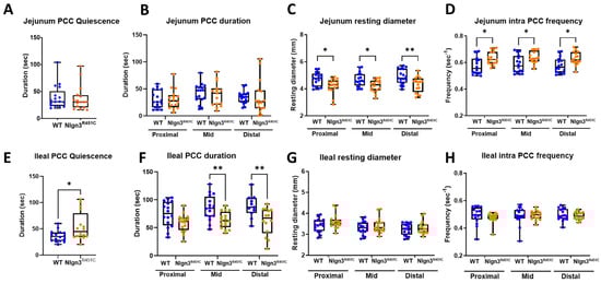 Small intestinal dysmotility in Nlgn3R451C mice. In the jejunum of Nlgn3R451C mice, no difference was identified in (A) PCC quiescence or (B) PCC duration (Shapiro–Wilk normality of residuals assumption passed w = 0.98, p = 0.2), however, the (C) resting diameter was reduced and the (D) intra PCC frequency was faster in all measured regions. In the ileum of the Nlgn3R451C mice, an increase in (E) PCC quiescence and a reduction in (F) PCC duration in the mid and distal regions was identified. (G) No difference in ileal resting diameter or (H) intra PCC frequency was detected between wild-type and Nlgn3R451C mice. (Student’s t-test. * p > 0.05, ** p < 0.01.)