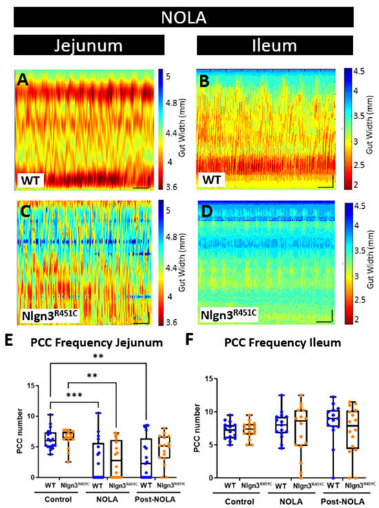 In the jejunum, PCC motility patterns were modified in the presence of NOLA (Figure 5A). Specifically, an increase in contractile activity resulted in PCCs being no longer distinguishable in 11 out of 17 of the wild-type and 9 out of 16 of the Nlgn3R451C gut segments. On average, NOLA reduced the number of defined PCCs per 15 min in the jejunum in both WT and Nlgn3R451C (WT (control): 6.3 ± 0.4, WT (NOLA): 2.7 ± 0.8; p = 0.0006; Nlgn3R451C (control): 6.3 ± 0.4, Nlgn3R451C (NOLA): 3.0 ± 0.7 PCCs; mean ± SEM, p = 0.002 (two-way ANOVA (factors: genotype and NOLA effect), Sidak correction); Figure 5A,C,E). In contrast, NOLA had no significant effect on ileal PCC frequency per 15 min (WT (control): 7.2 ± 0.3, WT (NOLA): 7.5 ± 0.7; p = 0.94, Nlgn3R451C (control): 7.2 ± 0.3, Nlgn3R451C (NOLA): 7.2 ± 1 PCCs; mean ± SEM, p > 0.99). In addition, NOLA did not alter ileal PCC velocity (WT (control): 0.4 ± 0.1, Nlgn3R451C: (control): 0.4 ± 0.06; p = 0.9, WT (NOLA): −0.1 ± 0.05, Nlgn3R451C (NOLA): −0.13 ± 0.1 mm/s mean ± SEM, p = 0.9) or duration. There were no changes in PCC duration in the proximal ileum under baseline conditions (WT (control): 74.1 ± 5.7, Nlgn3R451C (control): 58.5 ± 4 s p = 0.09, mean ± SEM).