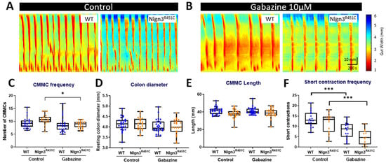 Gabazine reduces the proportion of short colonic contractions in Nlgn3R451C mice. Representative spatiotemporal maps of WT and Nlgn3R451C colonic activity in (A) control conditions and (B) after administration of 10 µM gabazine to the organ bath. (C) Effect of gabazine on CMMC frequency in WT and Nlgn3R451C mice. No changes were observed for (D) resting colon diameter or (E) CMMC length. (F) The short contraction frequency was reduced in both WT and Nlgn3R451C colons; WT n = 18; Nlgn3R451C n = 14. Calibration bar: 10 mm, 200 s. One-way ANOVA Holm–Sidak multiple comparisons test. * p < 0.05, *** p < 0.001.